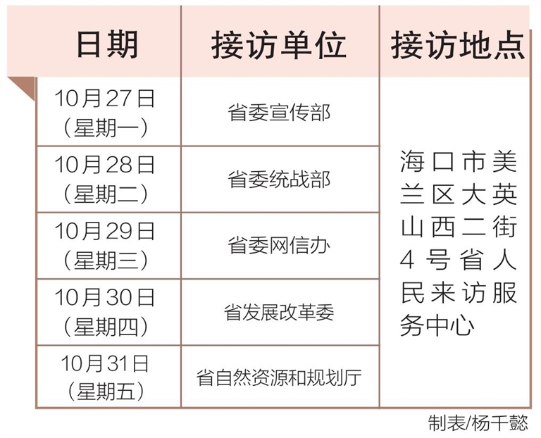 10月27日至31日,省委宣传部、省委统战部、省委网信办、省发展改革委、省自然资源和规划厅相关负责人将在海口市美兰区大英山西二街4号省人民来访服务中心接访群众。