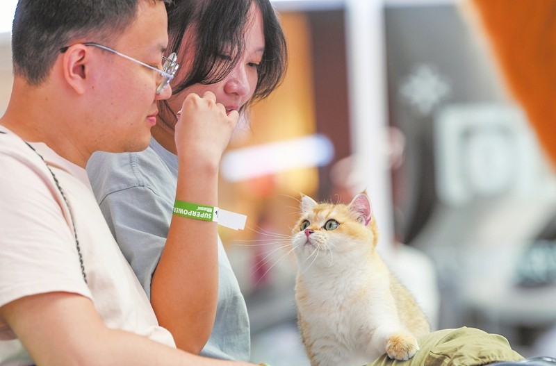 市民游客在宠物主题店铺内与小猫互动。