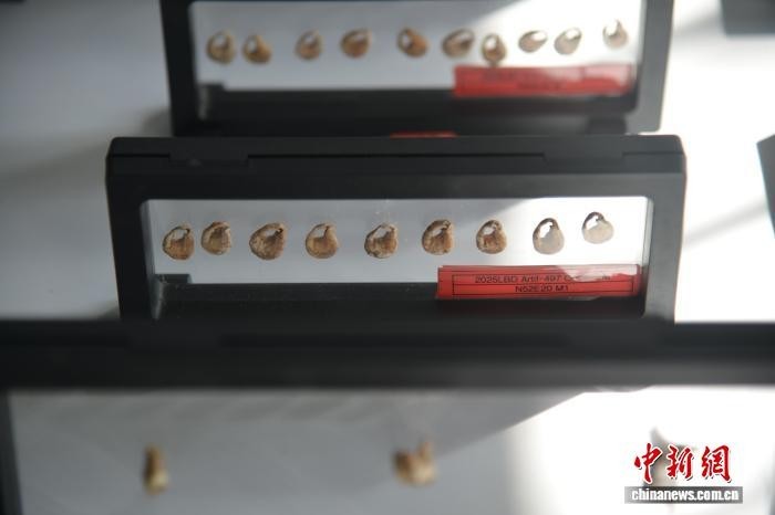 图为2025年度三亚落笔洞遗址联合考古发掘出的织纹螺贝饰标本。张月和 摄