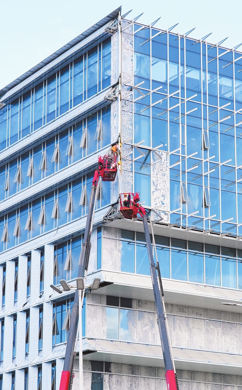 11月8日,在中国石油海南区域总部基地项目现场,工人在进行外立面施工。 本报记者 杨忠凯 摄