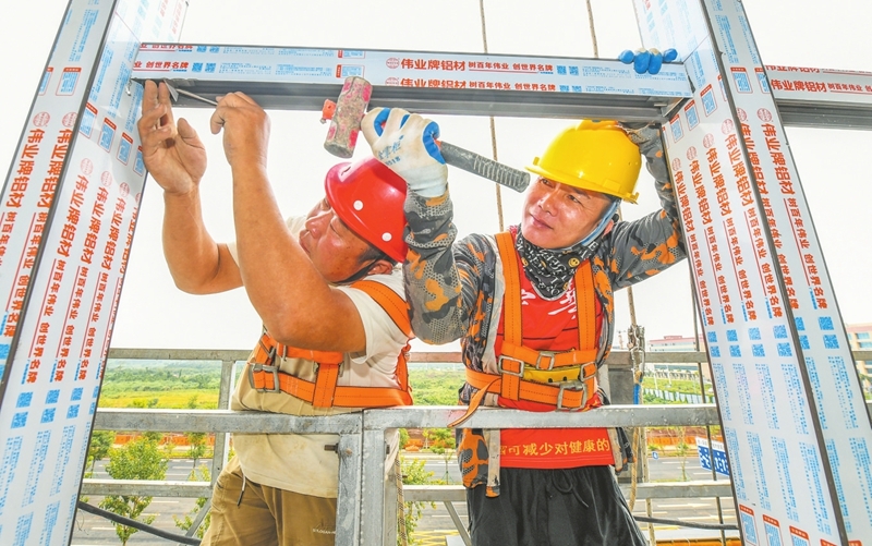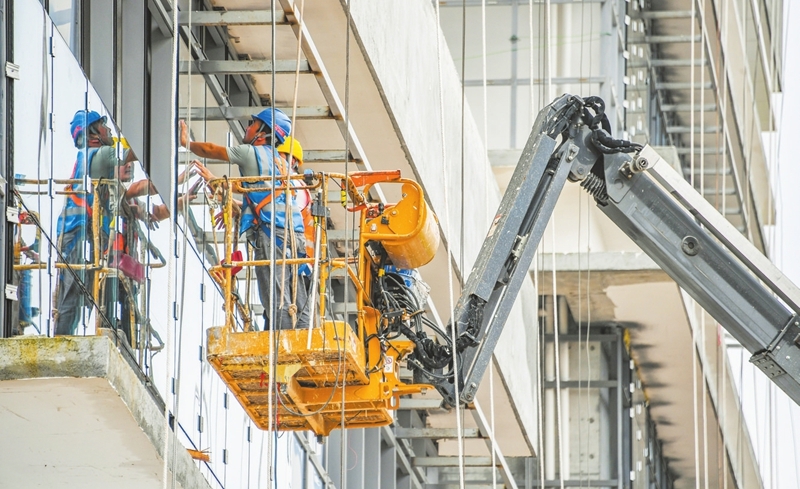 11月7日,在海口高新区生物医药产业创新中心项目现场,施工人员在安装玻璃幕墙。 本报记者 康登淋 摄