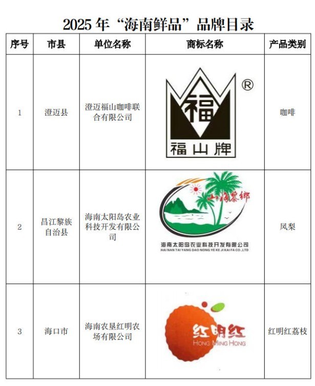 中新网海南新闻11月12日电 据海南省农业农村厅官网消息,2025年“海南鲜品”品牌目录近日公布,澄迈福山咖啡联合有限公司等20家企业列入。