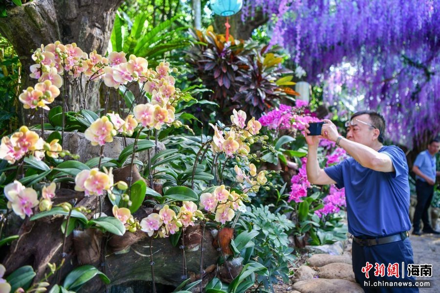图为三亚亚龙湾热带天堂森林旅游区兰花谷内多种兰花争奇斗艳,吸引游客拍照。骆云飞 摄