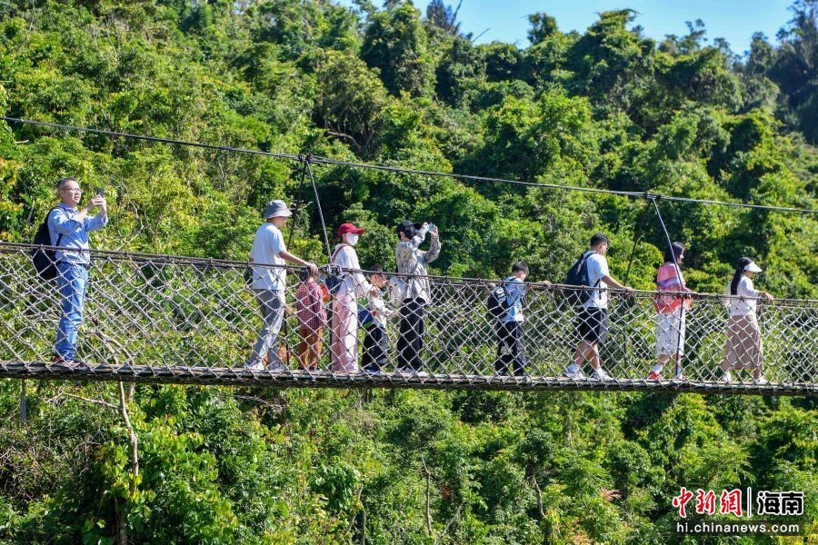 图为在三亚亚龙湾热带天堂森林旅游区,游客体验过江龙索桥。骆云飞 摄