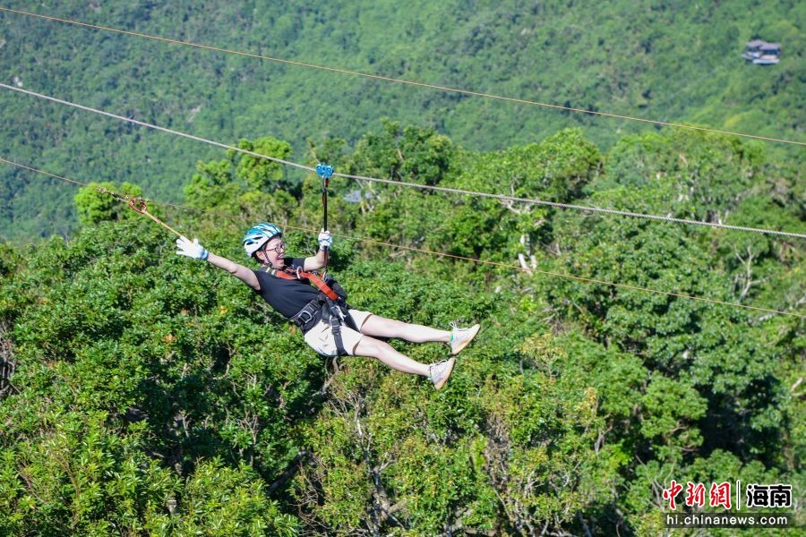 图为在三亚亚龙湾热带天堂森林旅游区,游客体验滑索。骆云飞 摄