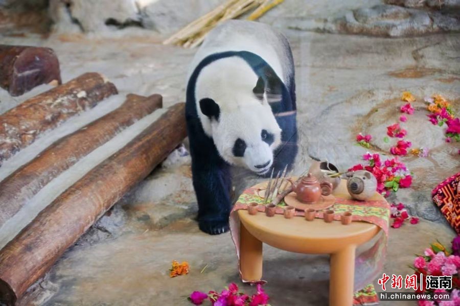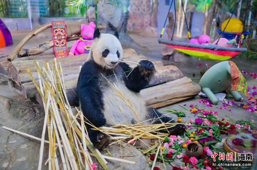大熊猫贡贡在享用登岛主题大餐。海南热带野生动植物园供图