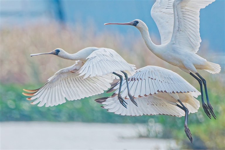 近日,3只国家一级保护野生动物黑脸琵鹭现身海口秀英区长流镇博养村湿地。这是今年该地区首次记录到黑脸琵鹭,也继2024年之后该区域的第二次记录。