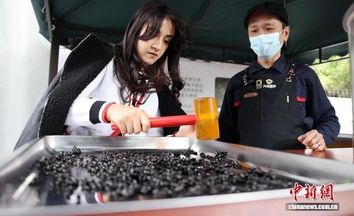 11月25日,中阿卫视主持人、记者阿思玛在海口现场体验海南老爸茶小吃的制作。 吴天军 摄