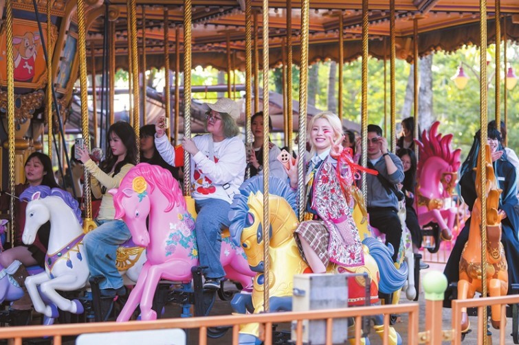 11月28日,在海南长影奇幻乐园,歌迷乘坐旋转木马,快乐无比。