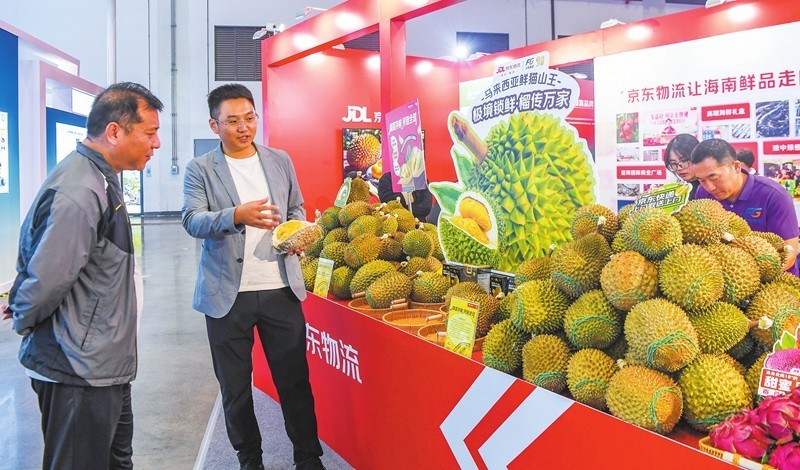不仅海口馆,其他展馆的海口企业同样亮点频出。在1号馆,海南丰观实业集团有限公司带来的气调保鲜马来西亚进口猫山王榴莲,一亮相就成为焦点。工作人员现场切开榴莲,金黄果肉香气四溢,“通过气调柜技术精准控温控气,实现‘原产地口感零差别’,让榴莲从树梢到餐桌都能保持最佳风味。”该公司电商部总经理张志鹏热情介绍,借助“专业洽谈+网红直播+美食品鉴”模式,该公司的进口榴莲已对接全国多家重点果蔬批发市场和连锁商超,直播频道订单不断,成了冬交会上的“爆款”。