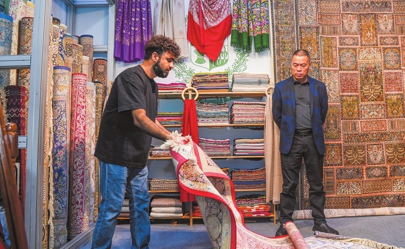 12月4日,第28届冬交会巴基斯坦展馆,工作人员在介绍特色 产品。