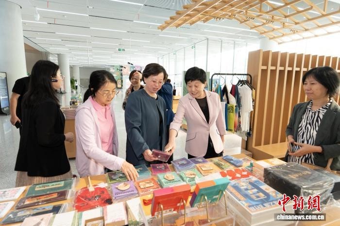 2025年4月17日,民进海南省委会主委潘惠丽(右二)率调研组赴上海多家图书馆开展“推动全民阅读,提升文明素养”调研。图为上海市图书馆党委副书记杨永梅(右三)介绍了上海图书馆建设发展情况。 民进海南省委会 供图