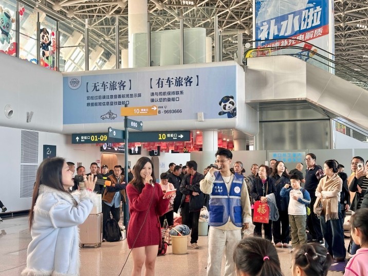 志愿者王宏伟已参与服务两年。今年,他不仅提供问路引导服务,还凭借音乐特长加入了快闪表演。“我也曾在外奔波,特别理解旅客,尤其是归乡人的心情。”他说,“希望能用歌声传递一点温暖,缓解大家等待的焦虑,帮助更多人轻松回家。”