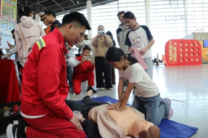 活动现场设置急救教学区,大小“朋友”积极互动。(秀英区供图)