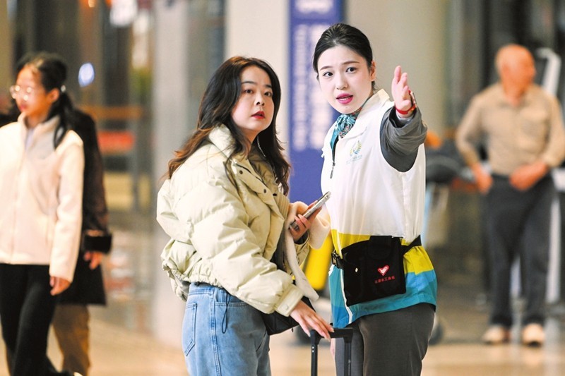 2月2日,在海口美兰国际机场,志愿者为旅客提供指引服务。
