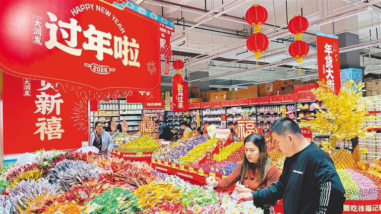 农历马年春节将至,海口许多超市通过打造“一站式”年货购物体验,满足市民多元化消费需求,椰城年味正浓。2月3日,海口市大润发超市年货大街红火开街,洋溢着喜庆祥和的节日氛围。货架上各色礼盒、干果特产琳琅满目,市民们穿梭其间精心挑选年货,现场人头攒动、购销两旺。海南日报全媒体记者 张茂 实习生 柳一诺 摄