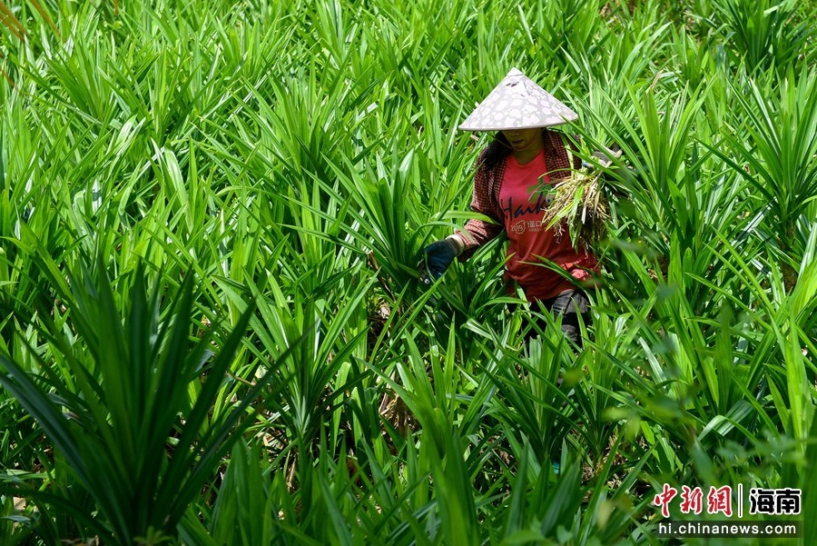 万宁市南桥镇桥北村村民在收割斑兰叶。凌楠 摄