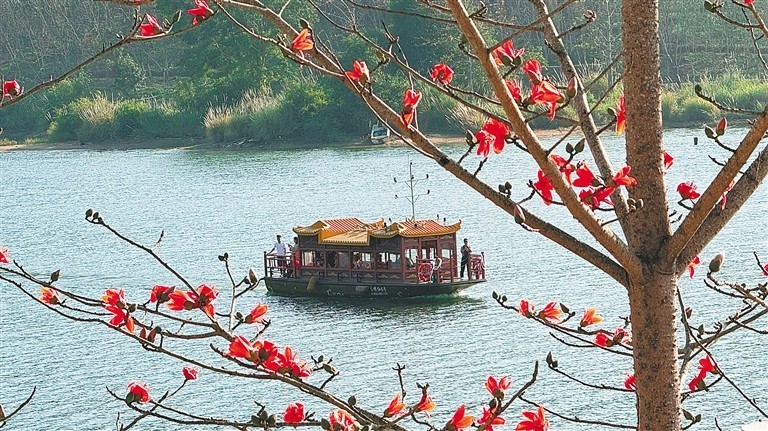 近日,游客在昌江黎族自治县昌化江畔木棉赏花码头坐船游江观光。