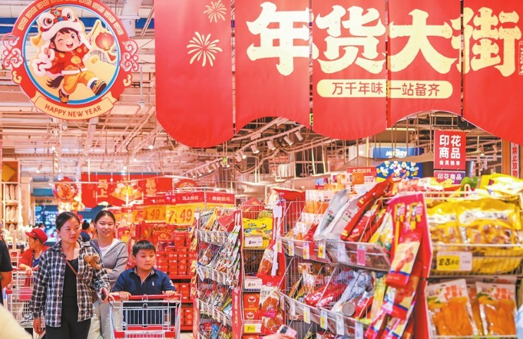 海口大润发国兴店更新展陈,营造出红火的新春氛围,市民在其中挑选年货。