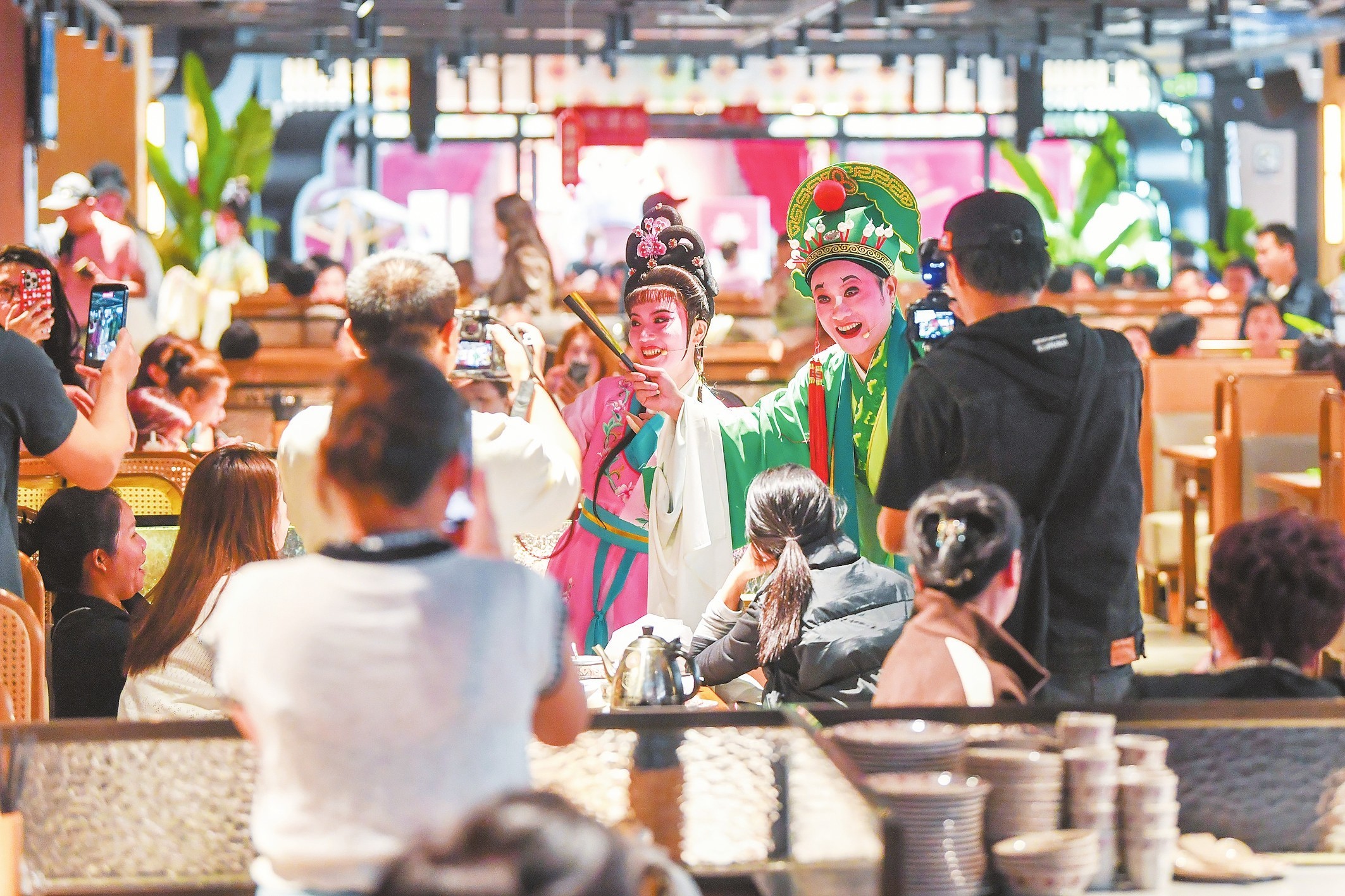 琼剧表演走进南珍茶楼中华城店,吸引众多市民游客打卡拍照。本报记者 苏弼坤 摄