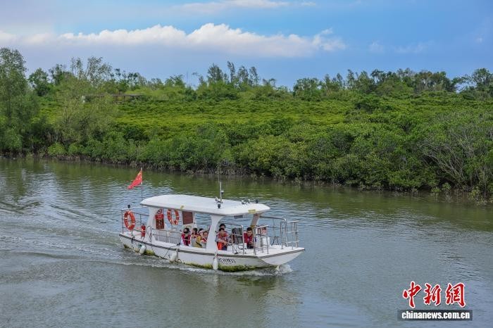 2025年5月3日,游客乘船穿行于海口东寨港红树林旅游区。中新网记者 骆云飞 摄