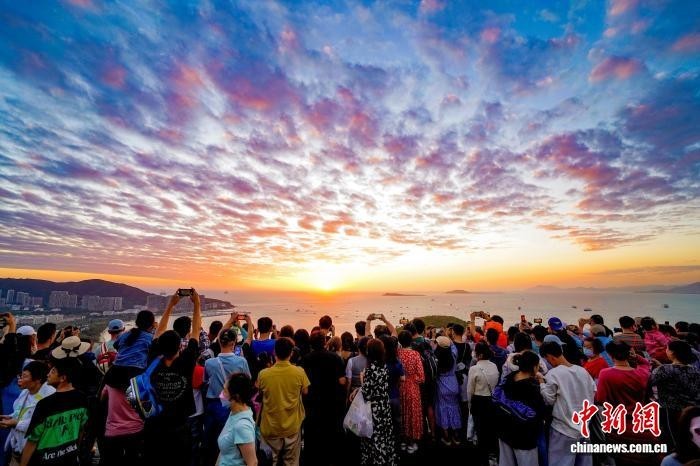 2月14日,来自国内外的众多游客相聚鹿回头风景区观景平台,共赏落日余晖,驻足打卡拍照。(三亚鹿回头风景区 供图)