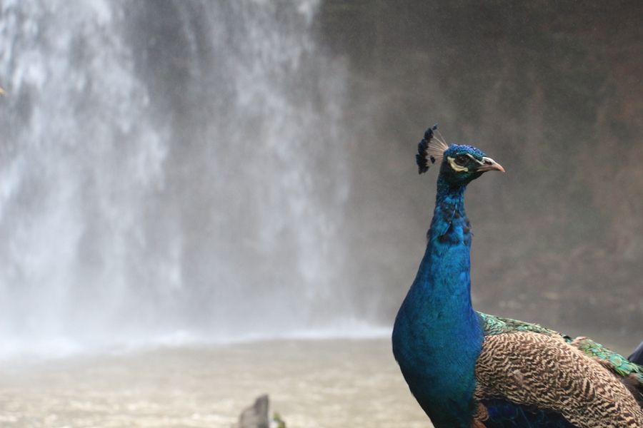 2月20日,临高古银瀑布景区,一只孔雀立于奇石之上,吸引众多游客驻足拍照。海南日报全媒体记者刘晓惠 摄