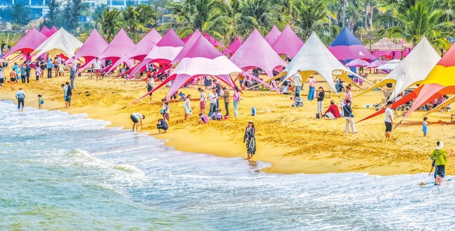 春节假期,海口秀英区西秀镇荣山寮村海岸线,彩色的帐篷点缀沙滩,游客纷至沓来,好一幅热闹的新春图景。 本报记者 康登淋 摄