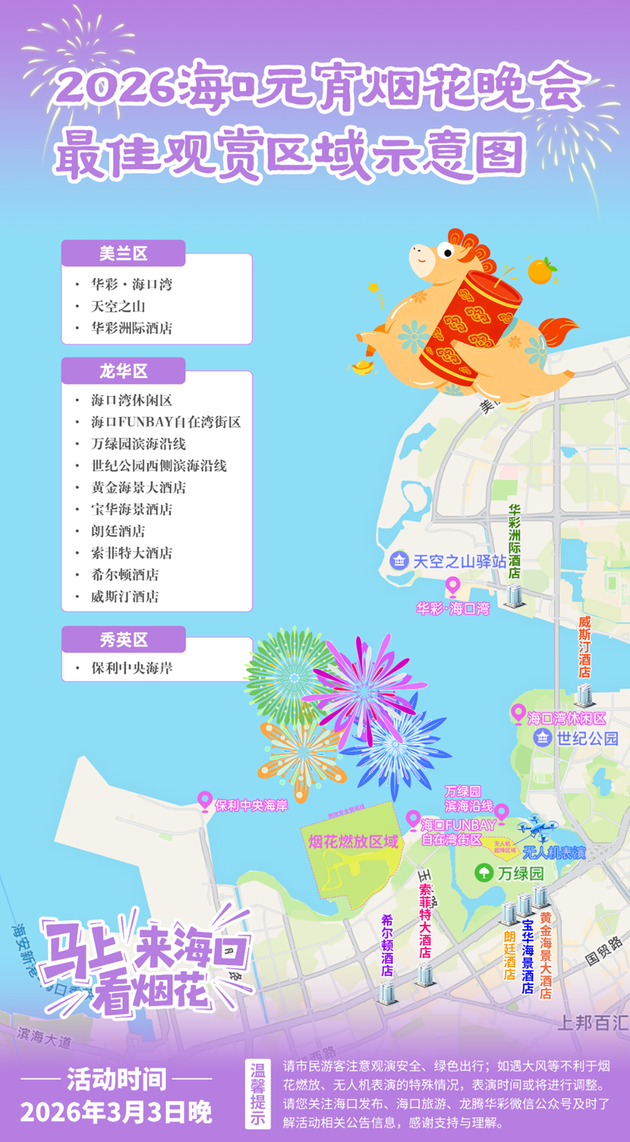 海口湾休闲区、海口FUNBAY自在湾街区、万绿园滨海沿线、世纪公园西侧滨海沿线、黄金海景大酒店、宝华海景酒店、海口朗廷酒店、海口索菲特大酒店、海口希尔顿酒店、海口威斯汀酒店(入住这些酒店可享绝佳视角,部分酒店推出元宵专属套餐)。