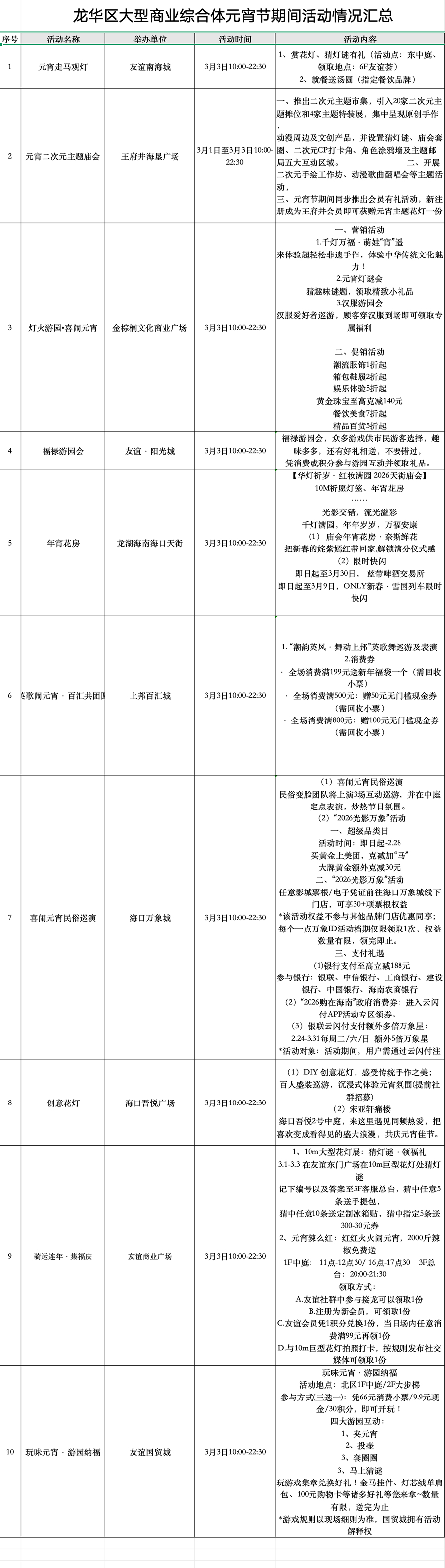 除了精彩纷呈的主题活动,龙华区各大商业综合体还推出服饰、箱包、黄金、餐饮、娱乐等全品类超值优惠,1折起购潮流服饰、黄金至高克减140元、餐饮美食7折尝鲜,多重福利加持,让市民在感受元宵欢乐氛围的同时,尽享消费实惠。