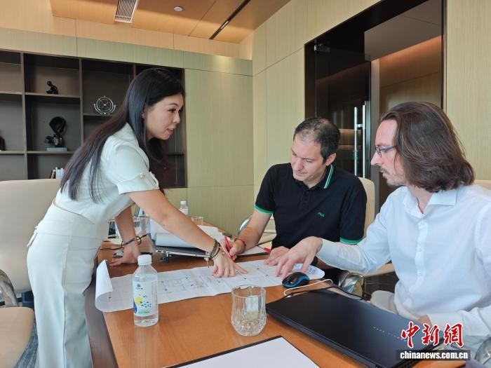 2月11日,海南三亚,意大利华裔青年胡莉莎(左一)与意大利设计师讨论中意(海南)会客厅项目建设事宜。张月和 摄