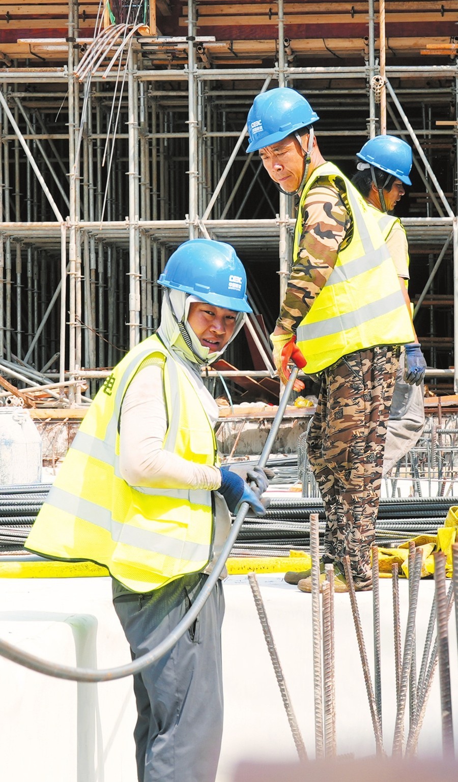 在北京师范大学海口附属学校小学部东岸校区扩建项目现场,施工人员在各作业面上忙碌。本报记者 杨忠凯 摄