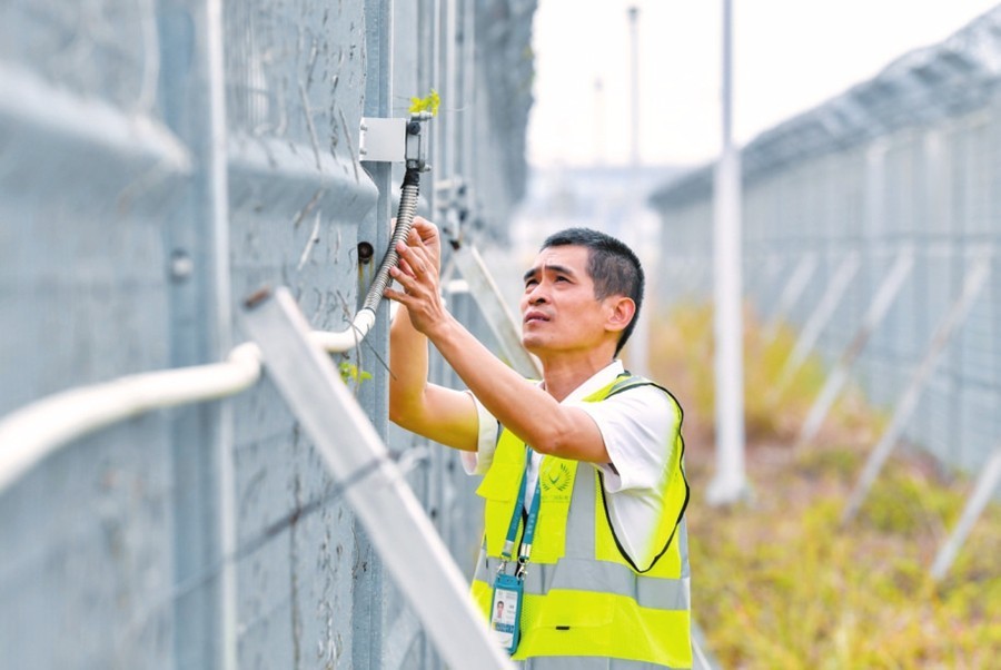 2月25日,美兰机场运维管理中心资深主管黄康正在巡查围界报警系统。本报记者 苏弼坤 实习生 陈新锐 摄