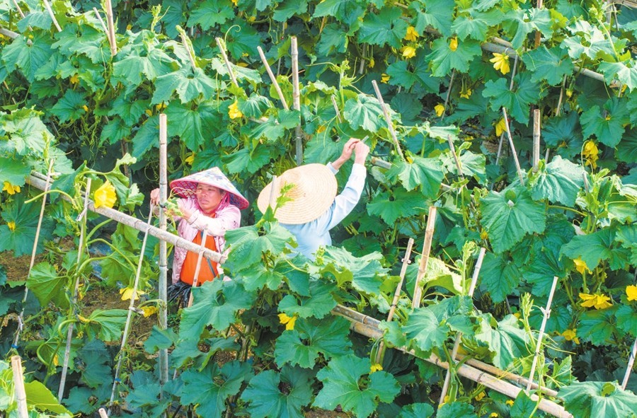 在秀英区东山镇马坡洋蔬菜基地,农户们正在瓜地里整理藤蔓。 本报记者 杨忠凯 摄