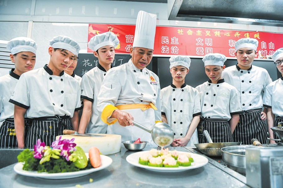 3月4日,在位于海口技师学院的省级技能大师周惟信工作室,周惟信(中)正在手把手教学生做菜。