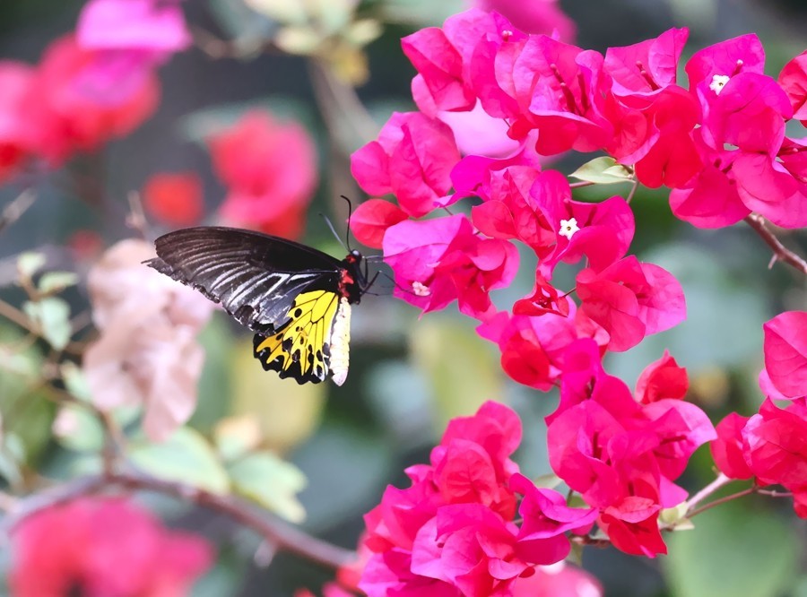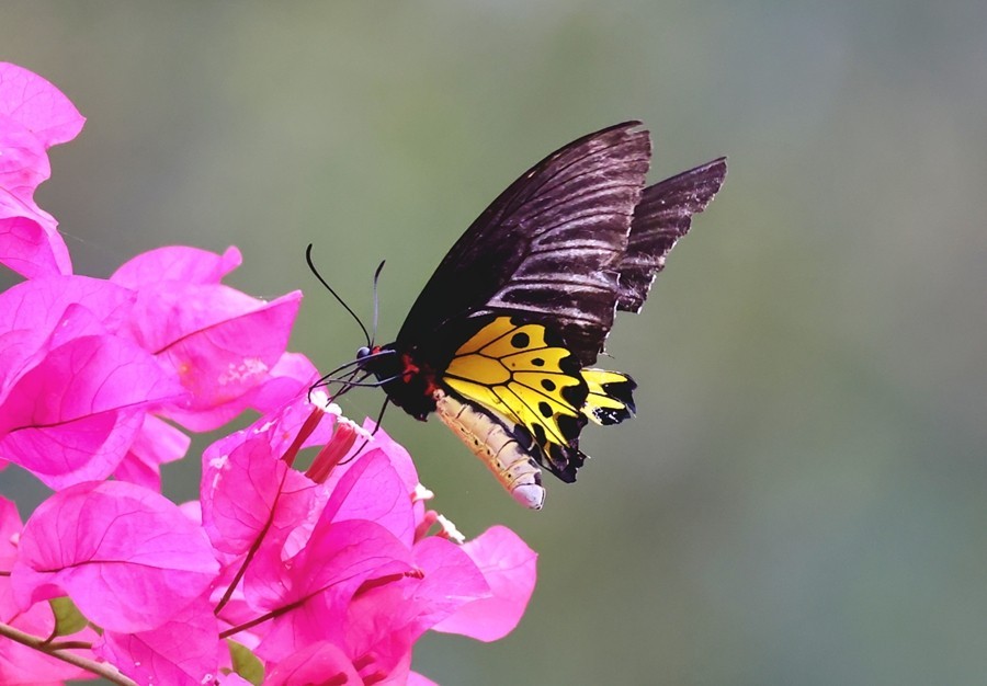 据了解,裳凤蝶是凤蝶科裳凤蝶属的一种大型蝴蝶,在2021年2月公布的《国家重点保护野生动物名录》中被列为二级保护动物。它飞翔姿态优美,后翅黄色斑在阳光照射下金光灿灿。成虫雌蝶体长47-52毫米,翅展120-140毫米;雄蝶体长45-50毫米,翅展110-130毫米,触角、头部和胸部为黑色,头、胸侧边有红色的绒毛。雌蝶前翅呈黑色或褐色,后翅中室及其周围亚外缘区各室的弯月斑均呈金黄色,其余部分黑色。雄蝶前翅黑色略透明,各翅脉两侧为白色,后翅金黄色,在外缘区有黑色三角斑,尾翼呈金黄色,无斑点。该物种主要分布于云南、海南、广东、广西、香港等地。