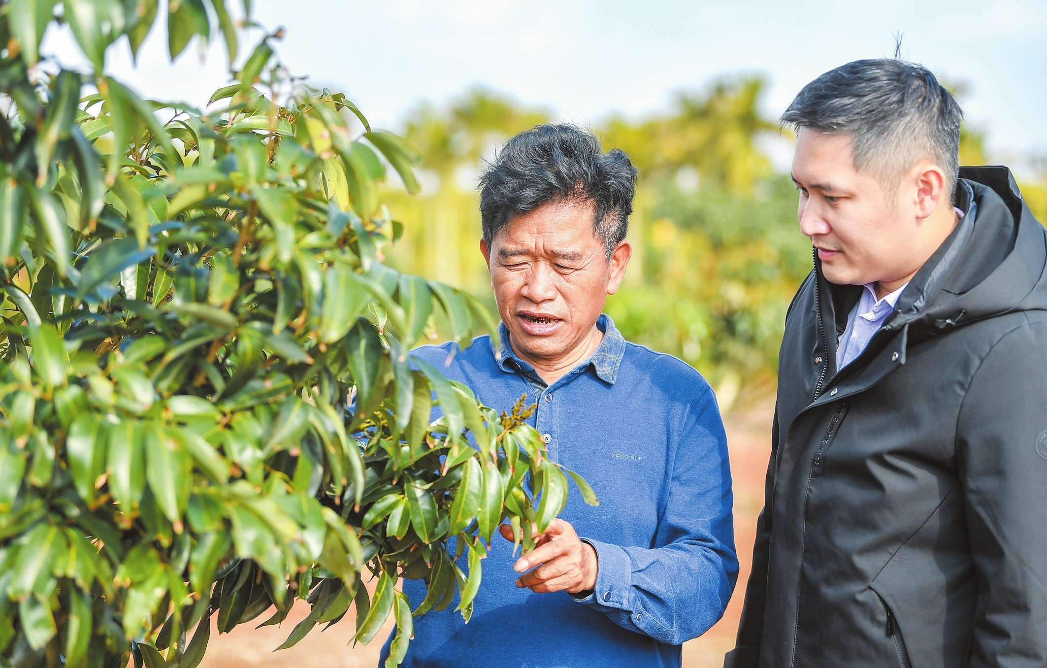 在琼山区三门坡镇一荔枝种植基地,种植户正在查看花期中的荔枝树。本报记者 苏弼坤 摄