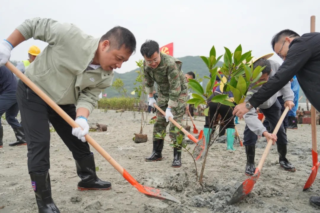 植树现场,市领导与党员干部群众共同铲土挖坑、扶苗正干,种下一株株红树林苗木。春雨拂过,新栽的树苗整齐排列、生机盎然,为这片土地披上一层新绿。