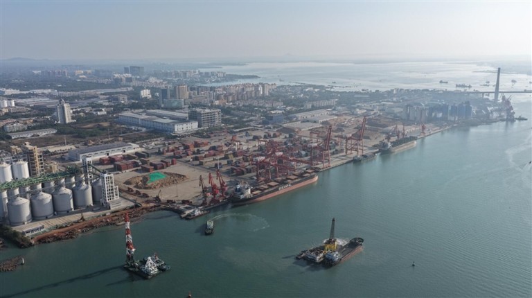 航拍国投洋浦港十万吨级公共粮油码头工程。邓晓龙 摄