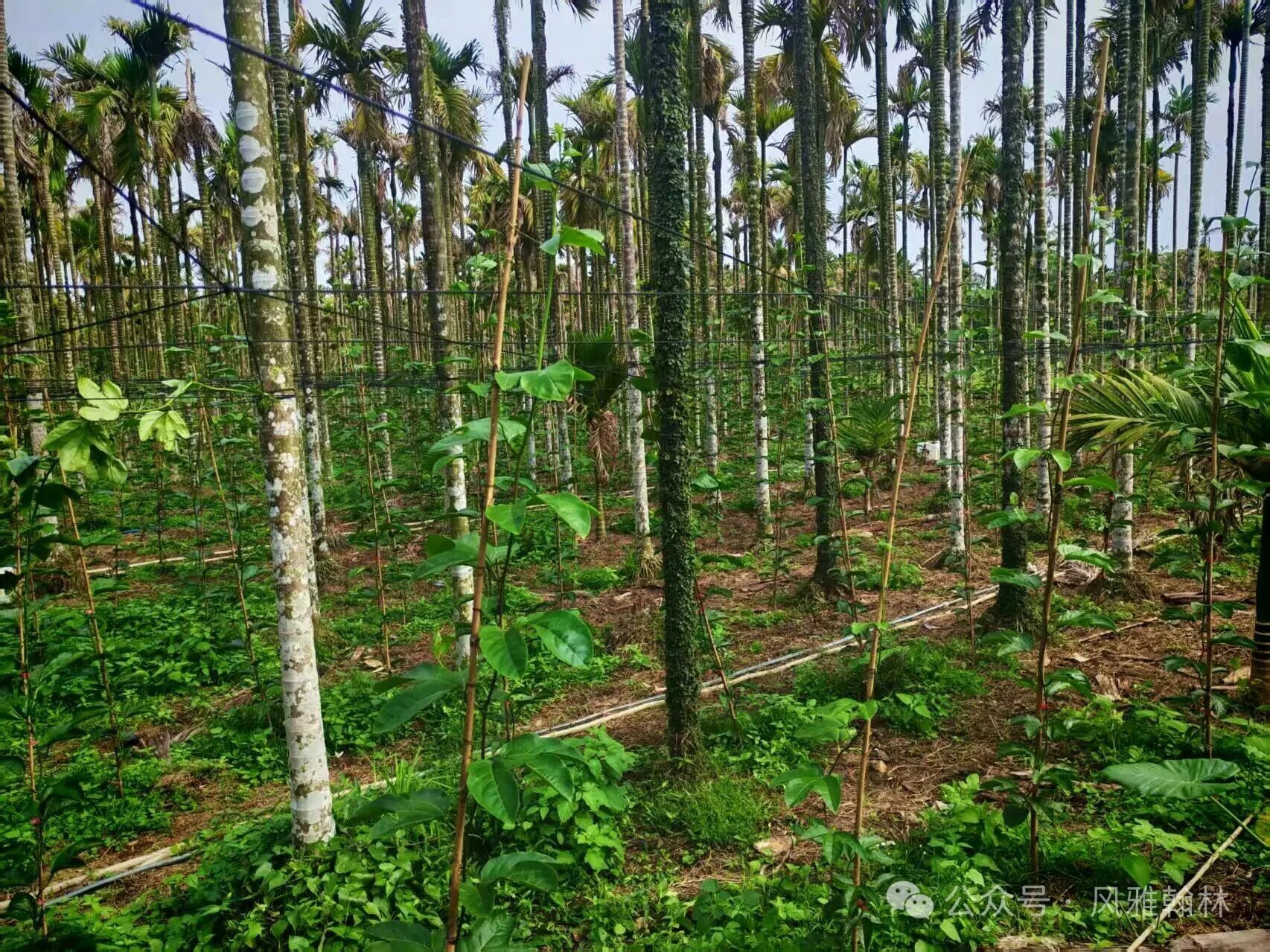 “以前这块地里光秃秃的,现在套种百香果,真是把‘废地’变‘宝地’了!”正在劳作的农户笑着算起“经济账”:“槟榔树正好当‘天然支架’,不用买竹竿拉铁丝,一亩能省好几百块。园里原来的滴灌系统直接能用,比单种槟榔还省心。”