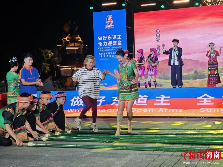 3月13日,第六届亚洲沙滩运动会文化进社区活动在三亚市天涯区三亚湾壹号启幕。图为民众参与竹竿舞互动。张月和 摄