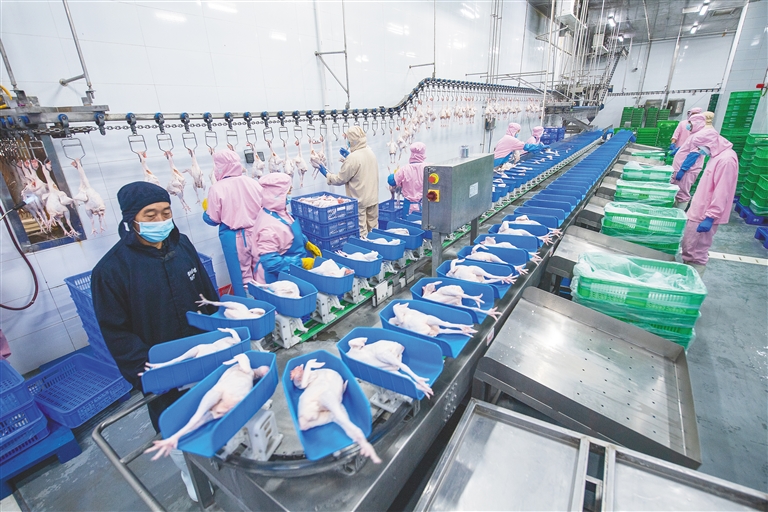 近日,海南(潭牛)文昌鸡股份有限公司生产加工车间里,一只只文昌鸡经全自动设备完成处理工序后,被工人们娴熟地切块、打包、装箱。加工完成的文昌鸡一部分将运往全国各大商超、餐饮门店,另一部分将远销新加坡等地。据悉,企业引进的全自动屠宰生产线,实现了屠宰加工全流程智能化,生产效率提升约70%。海南日报全媒体记者 袁琛 摄