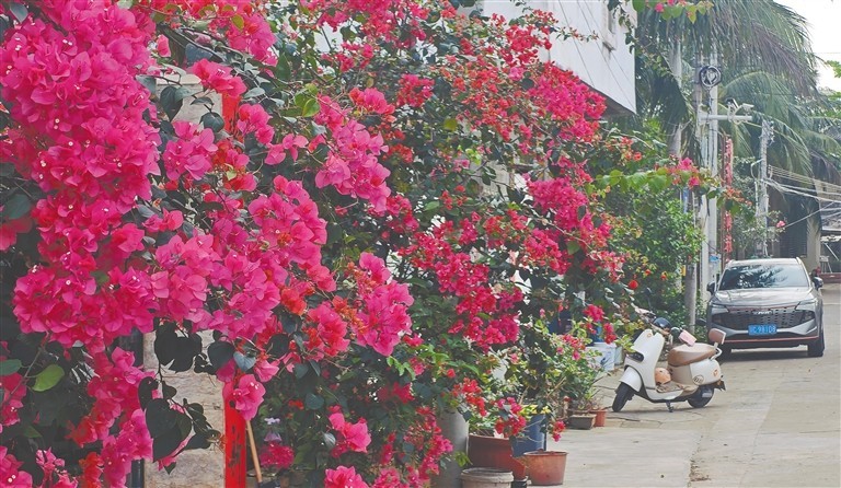 3月15日,在洋浦经济开发区洋浦大桥下的居民区,三角梅竞相绽放。海南日报全媒体记者 陈元才 摄