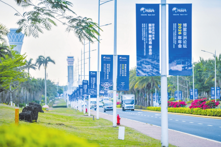 本届年会以“塑造共同未来:新形势、新机遇、新合作”为主题,将于3月24日至27日举办。目前,道路两侧印有论坛标识与年会主题的道旗整齐排列,与椰树、鲜花相映成趣,充分展现海南自贸港开放活力。 本报记者 苏弼坤 摄