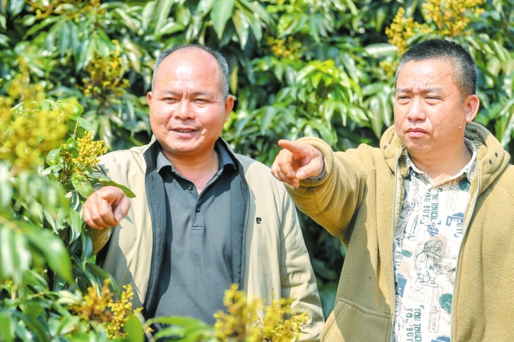 “土专家”周式武(右)和三门坡镇农业服务中心工作人员一起查看荔枝长势。