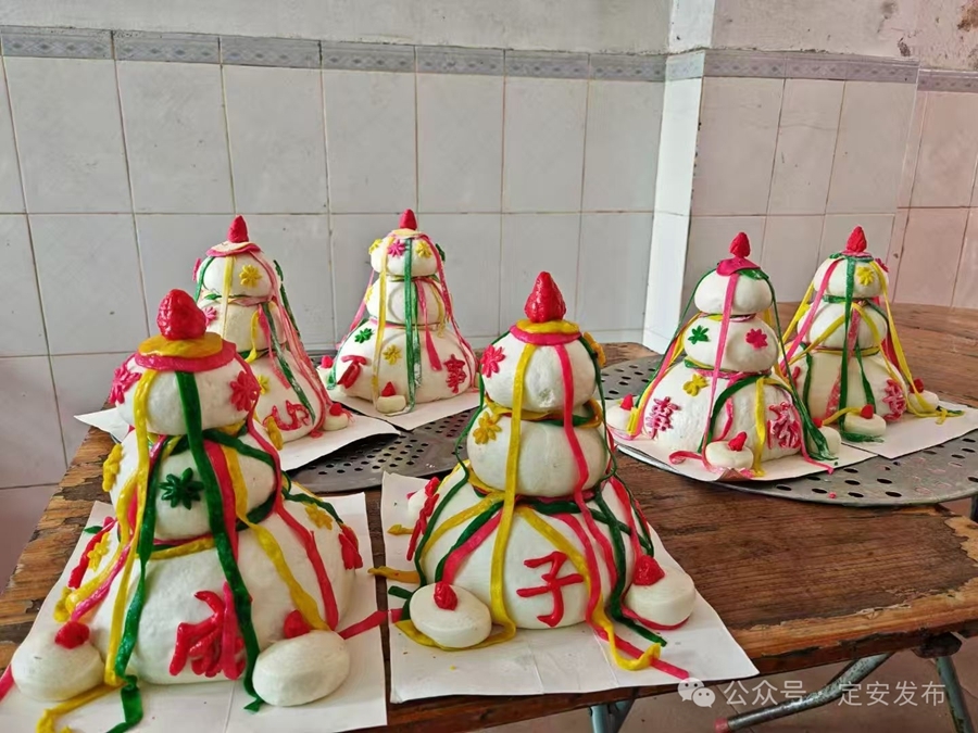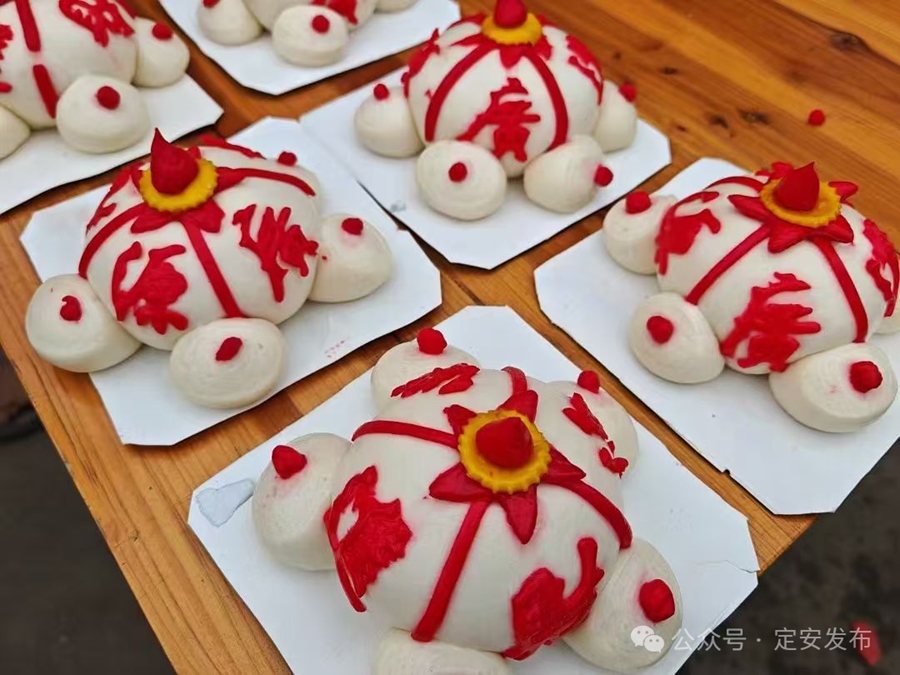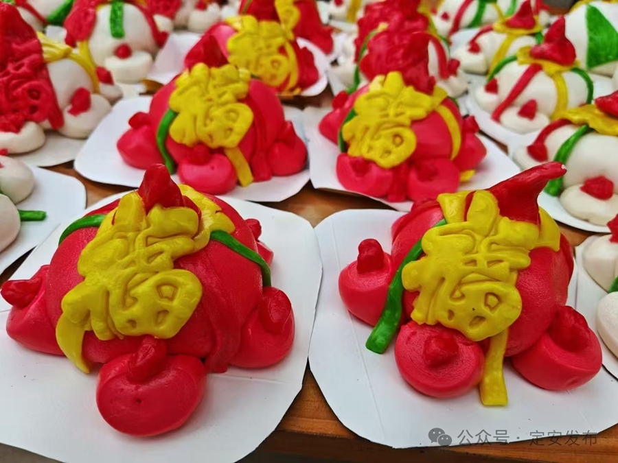 生仔包子造型丰富,色彩鲜艳。有的包子表皮点缀着红、黄、绿等颜色的图案,有的则用食用色素和面,捏成红色五角星或小花的形状贴在包子表面。还有的包子通体染红,或用彩色面塑在表皮写下“万事如意”“早生贵子”“丁财并进”“出入平安”等吉祥话。蒸制出炉的生仔包子不仅颜值出众,更承载着百姓祈福纳祥的美好心愿。