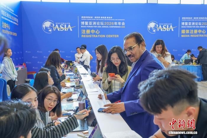 3月23日,海南博鳌,与会嘉宾在博鳌亚洲论坛2026年年会注册中心领取证件。 中新网记者 骆云飞 摄