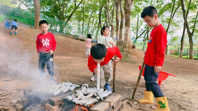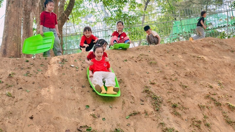 一年多前,这片承载着欢乐的“丛林探险园”还是一处后山荒地。2024年10月,幼儿园将其扩建为十亩原生态户外场地,保留原有高坡、低坡、植被,因地制宜规划出泥坑区、水渠区、野战区、攀爬区等12个幼儿游戏区域。