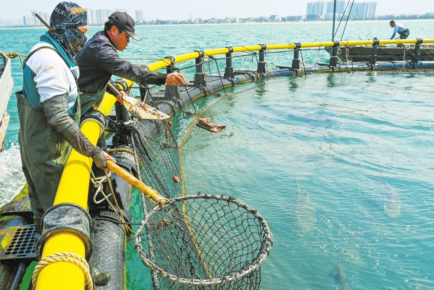 海口市荣山寮村海域,工作人员投喂网箱内养殖的海甘鲳。本报记者 石中华 摄