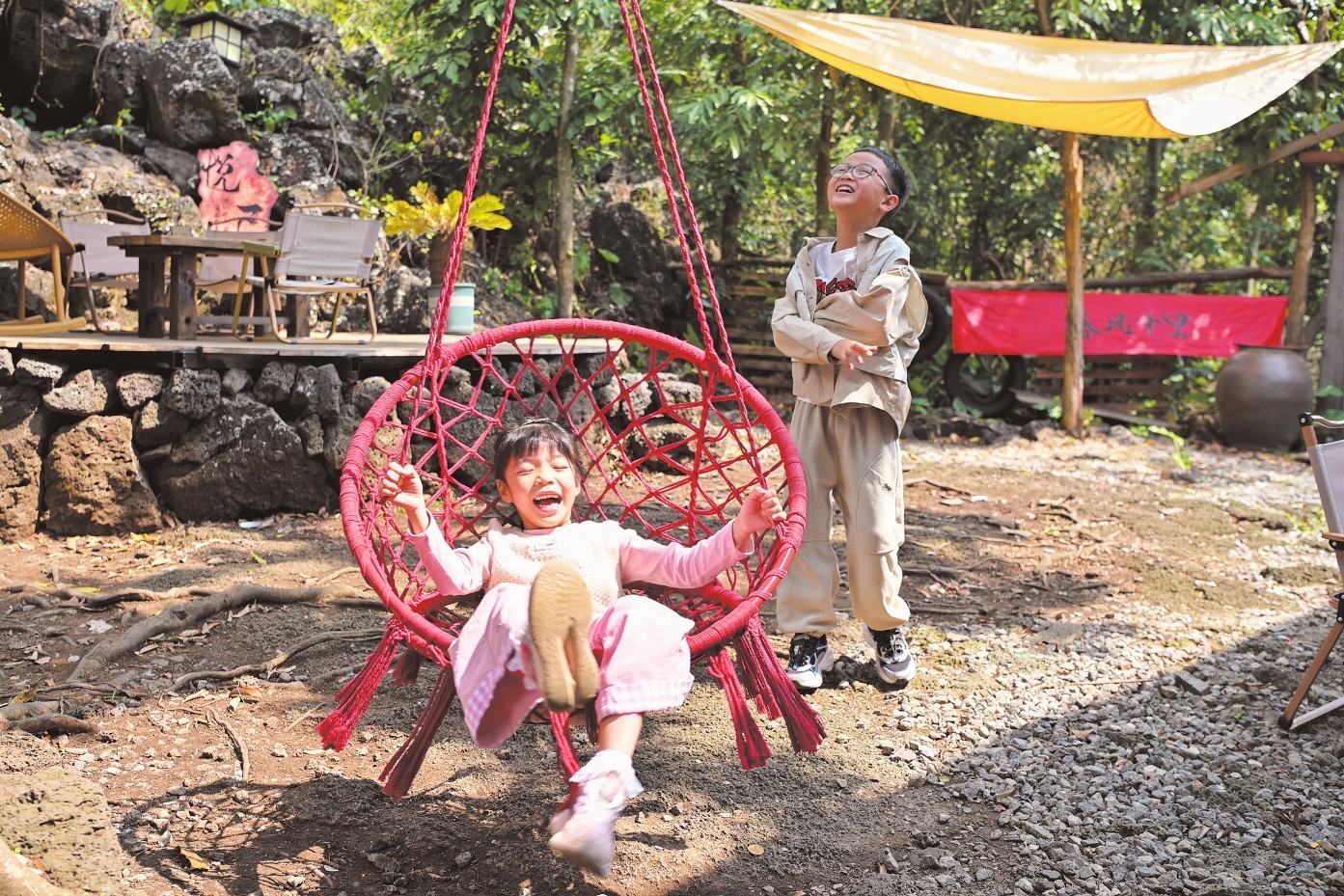 在海口秀英区石山镇道堂村委会三卿村内,孩子们在春风十里非遗小院游玩。本报记者 石中华 摄